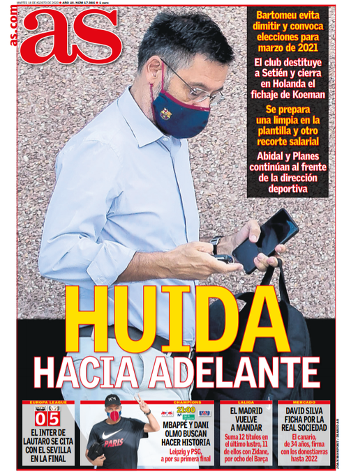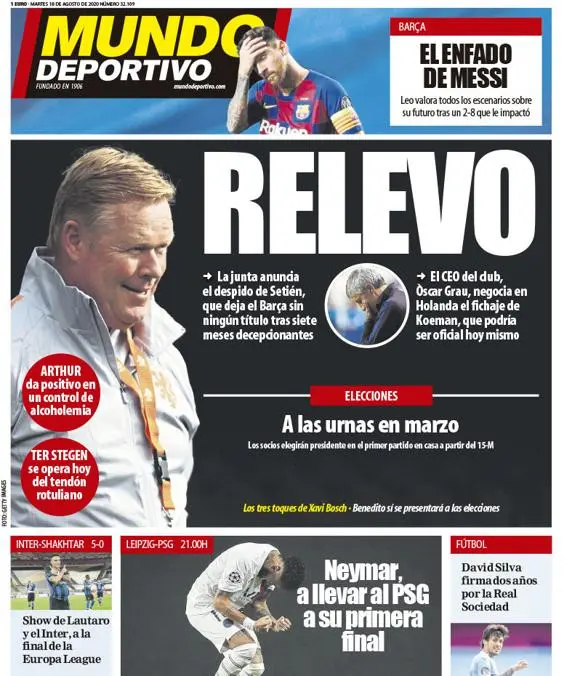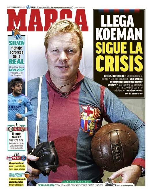 ركزت الصحيفة على برشلونة وقرب تعيين الهولندي رونالد كومان مدربا جديدا وأزمة الفريق وكتبت :" كومان سيكون المدرب التالي " و " بارتوميو لن يستقيل ".
