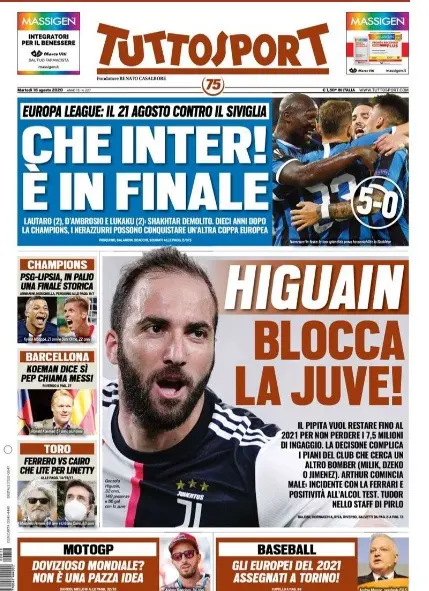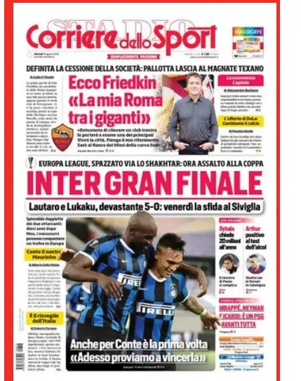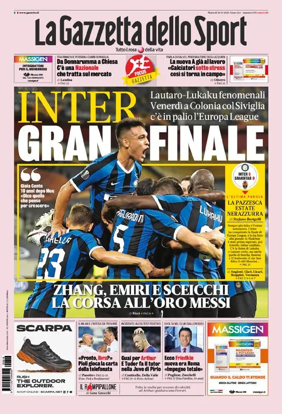 ركزت الصحيفة على تأهل إنتر ميلان لنهائي الدوري الأوروبي على حساب شاختار دونيتسك الأوكراني وكتبت :" إنتر ميلان في النهائي الكبير ".