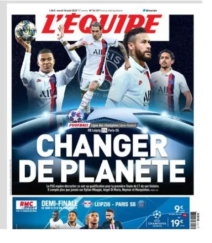 ركزت الصحيفة على نصف نهائي دوري أبطال أوروبا والذي سيجمع باريس سان جيرمان الفرنسي ولايبزغ الألماني وكتبت :" غيروا العالم ".