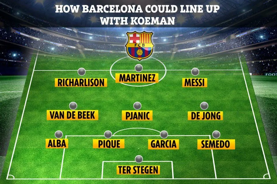توقعت صحيفة "صن" البريطانية التشكيلة التي سيقودها المدرب الهولندي رونالد كومان، بعد توقيعه رسميا على عقود قيادته نادي برشلونة.