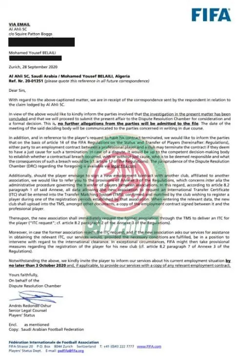 ووفقًا لما ذكرته صحيفة "الجزيرة" السعودية، اليوم الثلاثاء، فإن"بلايلي تمكن من فسخ عقده رسميًا مع الأهلي، وقام الاتحاد الدولي لكرة القدم (فيفا) بمخاطبة الفريق السعودي وطلب منه تمكين اللاعب من التعاقد وتسجيله في نادٍ آخر".