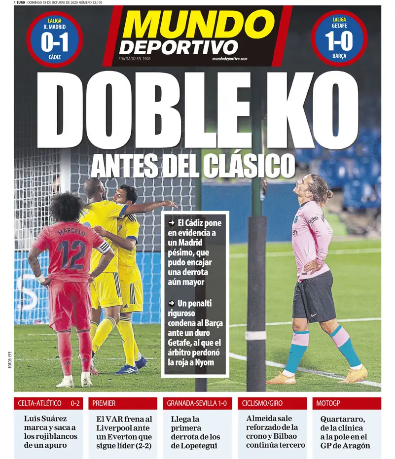 ركزت الصحيفة على خسارة ريال مدريد أمام قادش وبرشلونة أمام خيتافي بنفس النتيجة 1-0، وكتبت: "سقوط ثنائي قبل الكلاسيكو".