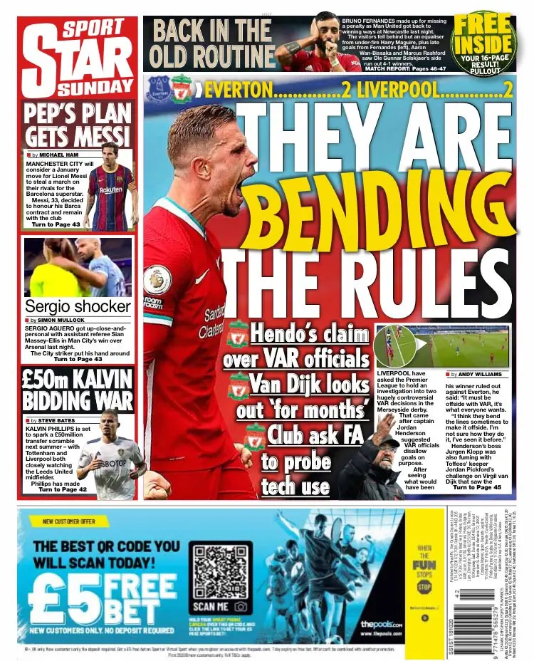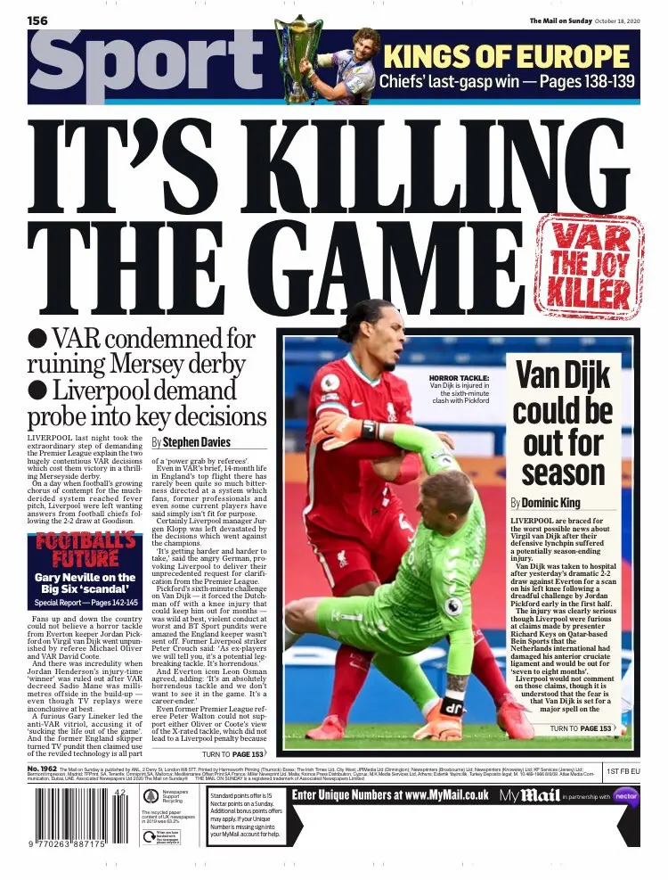 ركزت الصحيفة على تعادل ليفربول مع إيفرتون في "ديربي الميرسيسايد"، مساء السبت، والجدل الذي أثير بسبب الـVAR، وعنونت: "هم من يضعون القواعد"، اتهام هندرسون لحكام تقنية الفيديو.. ومن المحتمل غياب فان دايك فترة طويلة، والنادي يطالب الاتحاد الإنجليزي بإعادة النظر في استخدام التقنية.