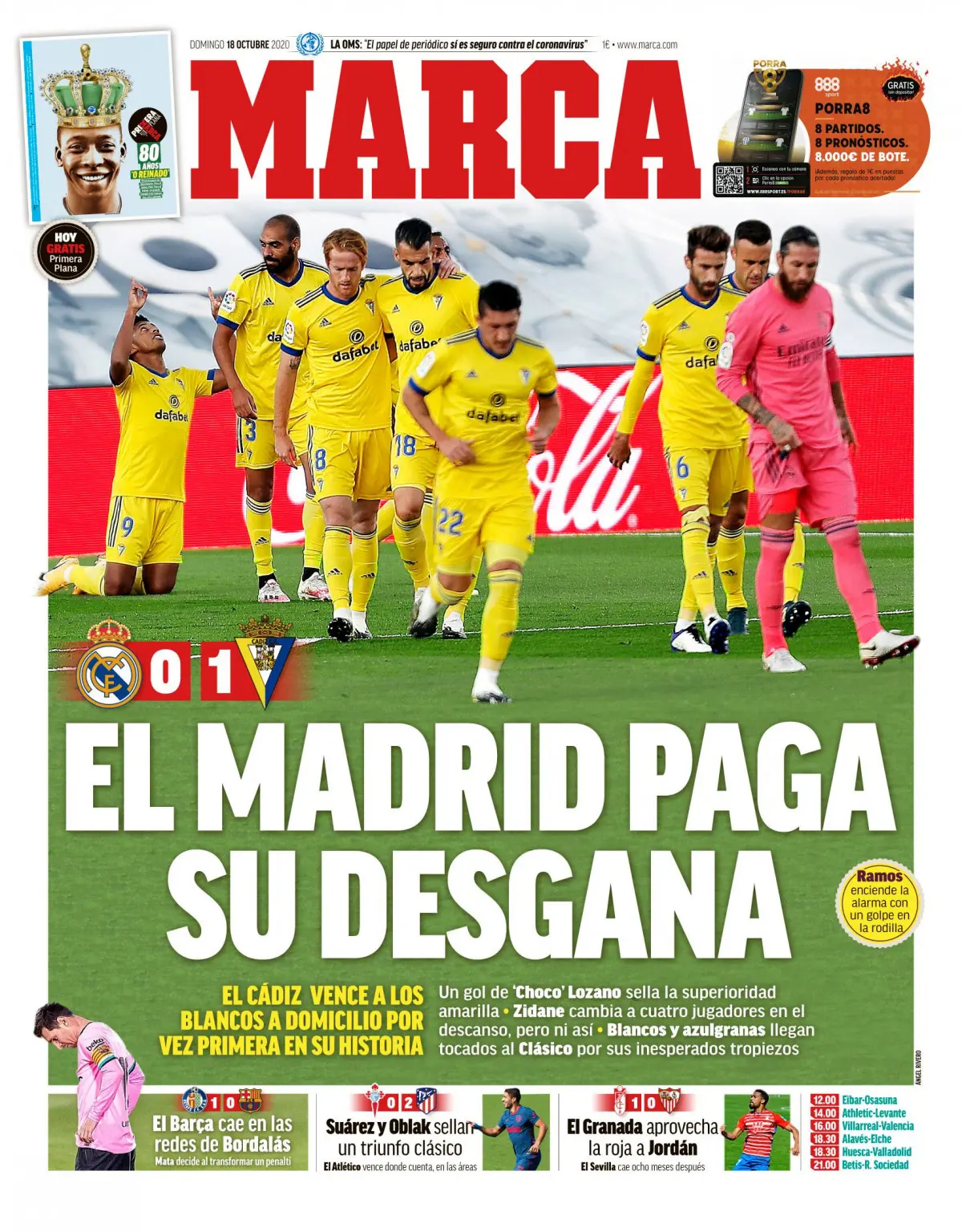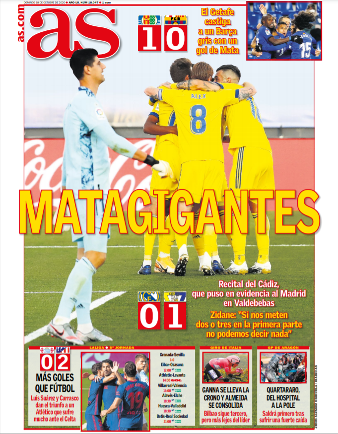 ركزت الصحيفة على خسارة ريال مدريد في ملعبه أمام قادش 1-0 في الدوري الإسباني، وكتبت: "قاتل العملاق".