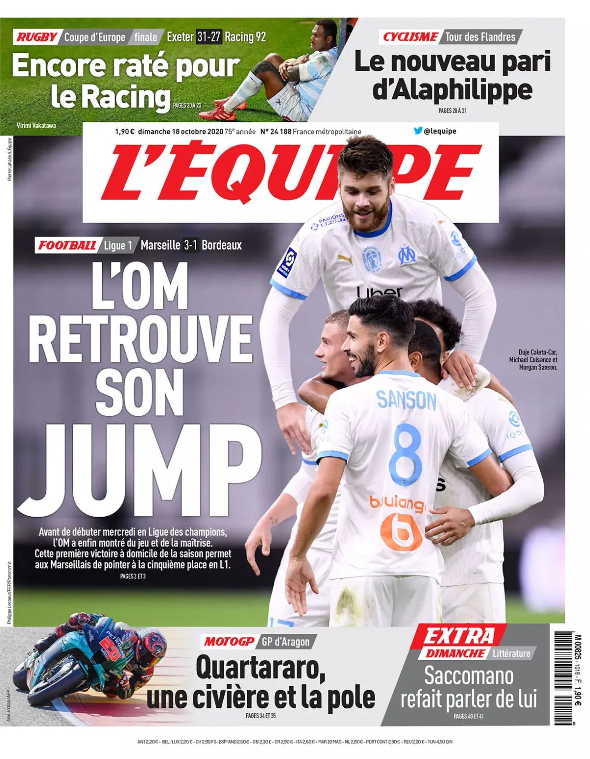 ركزت الصحيفة على فوز أولمبيك مارسيليا أمام بوردو 3-1 في الدوري الفرنسي، وكتبت: "أولمبيك مارسيليا يجد قفزته".