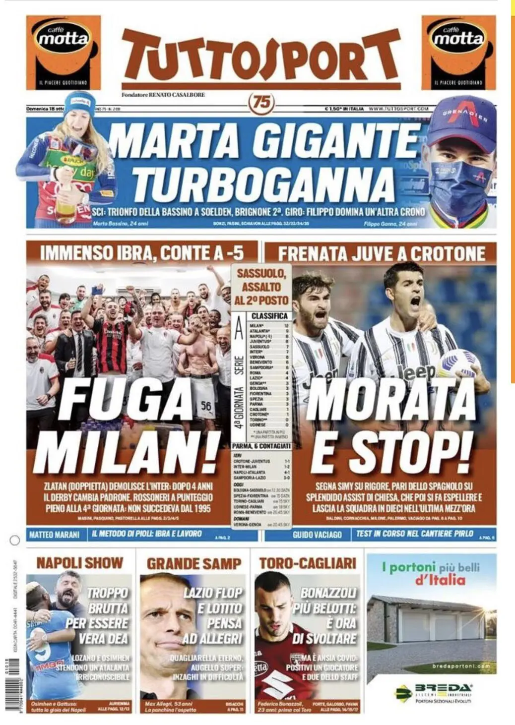 ركزت الصحيفة على فوز ميلان أمام جاره إنتر ميلان2-1 وتعزيز صدارته للدوري وتعادل يوفنتوس أمام كروتوني، وكتبت: "ميلان هرب" و"موراتا وفقط".