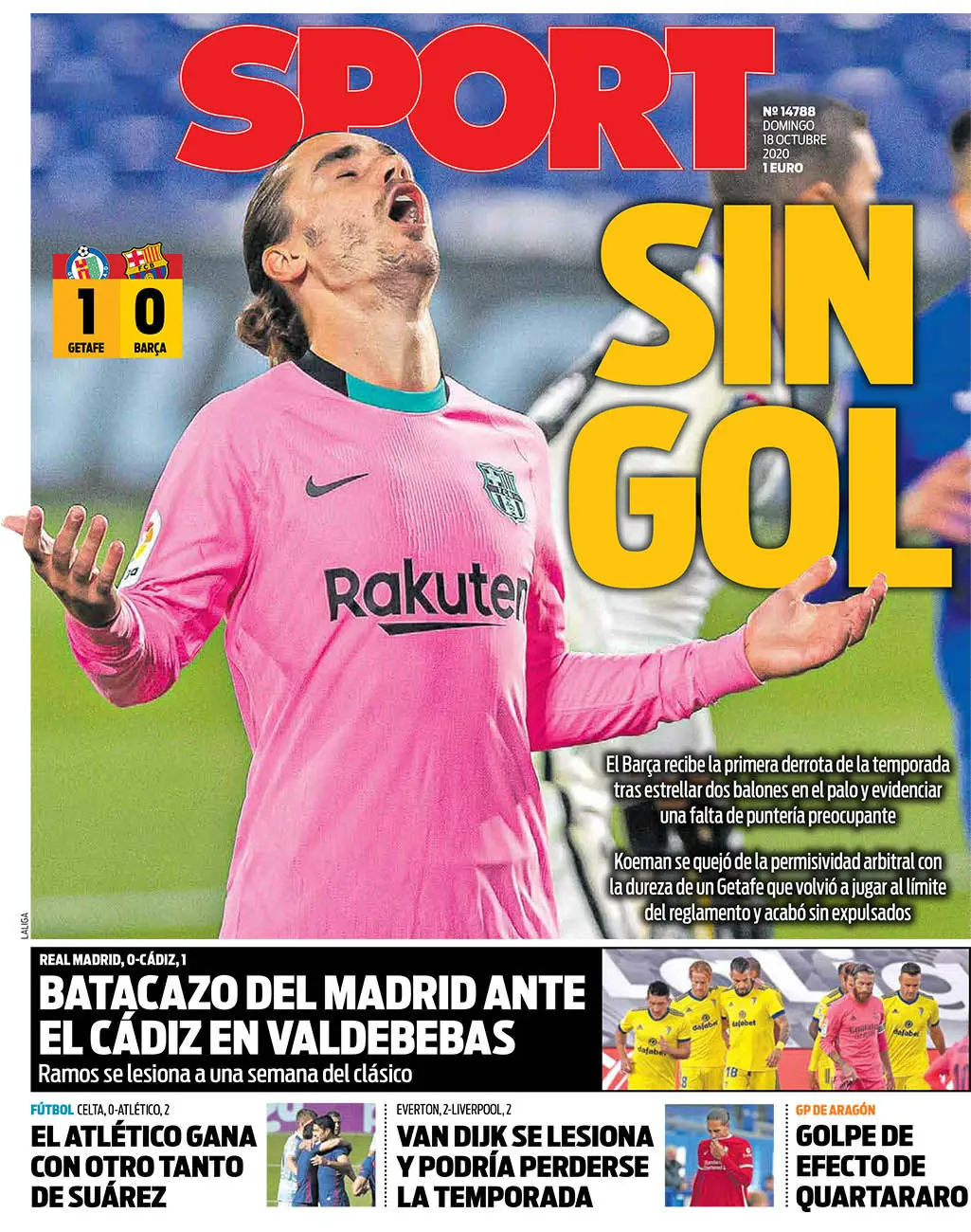 ركزت الصحيفة على هزيمة برشلونة أمام خيتافي 1-0 في الدوري الإسباني، وكتبت: "دون أهداف"، كما تحدثت عن هزيمة ريال مدريد في ملعبه أمام قادش، وكتبت: "ضربة لريال مدريد في ملعبه أمام قادش وراموس يصاب قبل أسبوع من الكلاسيكو".