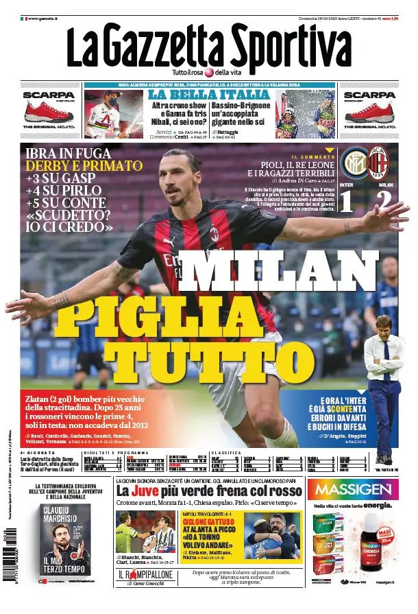 ركزت الصحيفة على فوز ميلان بالديربي أمام إنتر ميلان، وهو الفوز الرابع على التوالي ليعزز صدارته للدوري الإيطالي، وكتبت: "ميلان يأخذ كل شيء".