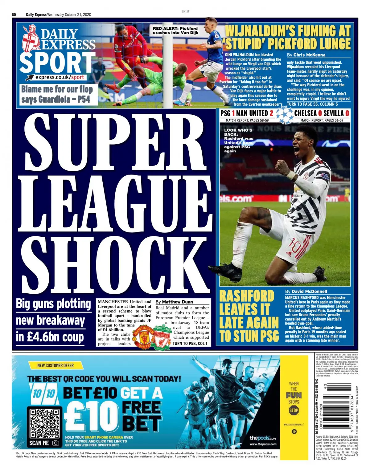 تطرقت الصحيفة للحديث عن فكرة إقامة بطولة جديدة للأندية الأوروبية الكبيرة، وعنونت: "صدمة الدوري"، الأندية الكبيرة تهدف للدخول في دوري جديد بقيمة 4.6 مليار جنيه إسترليني.