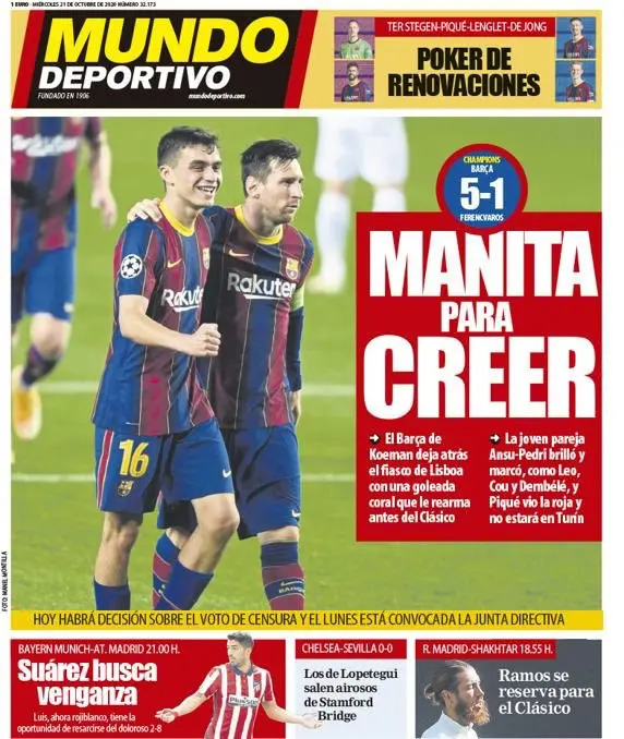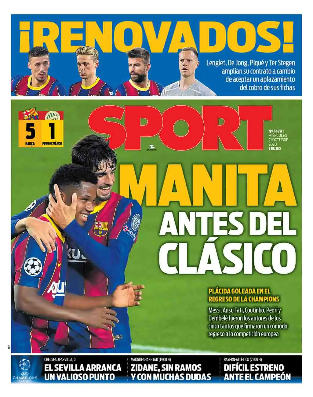 ركزت الصحيفة على الفوز الكبير لبرشلونة 5-1 أمام فريق فرينكفاروزي المجري في بداية مشوار الفريق في دوري أبطال أوروبا، وكتبت: "يد صغيرة قبل الكلاسيكو".