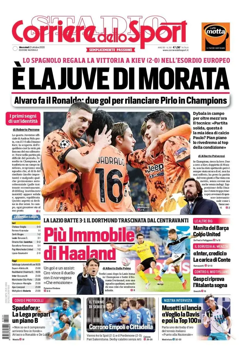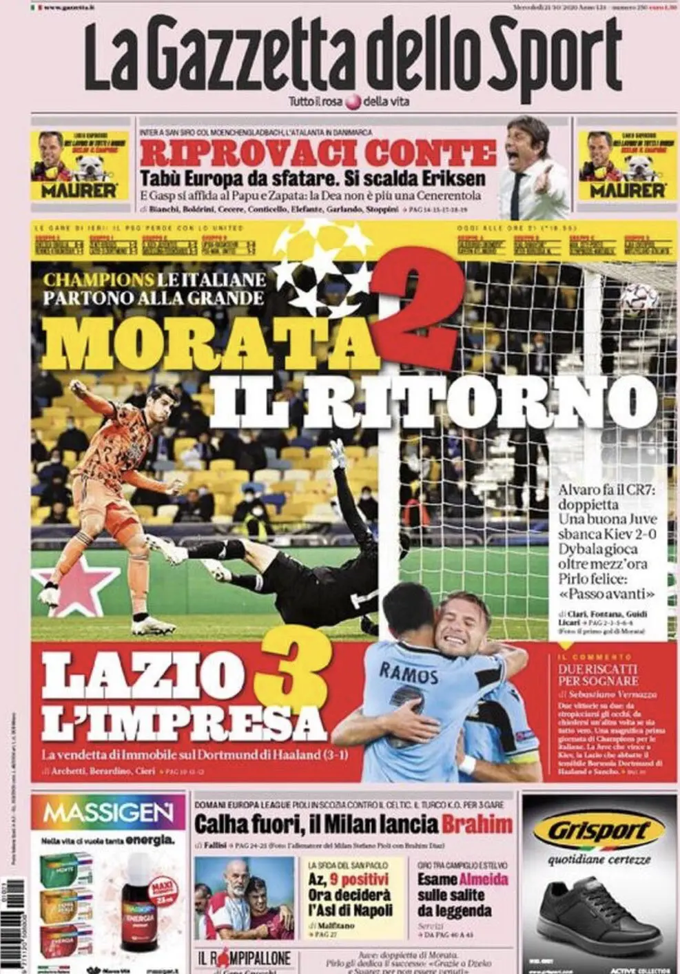 ركزت الصحيفة على فوز يوفنتوس ولاتسيو في بداية مشوارهما بدوري أبطال أوروبا أمام دينامو كييف وبروسيا دورتموند، وكتبت: "موراتا 2 العودة.. لاتسيو 3 الشركة".