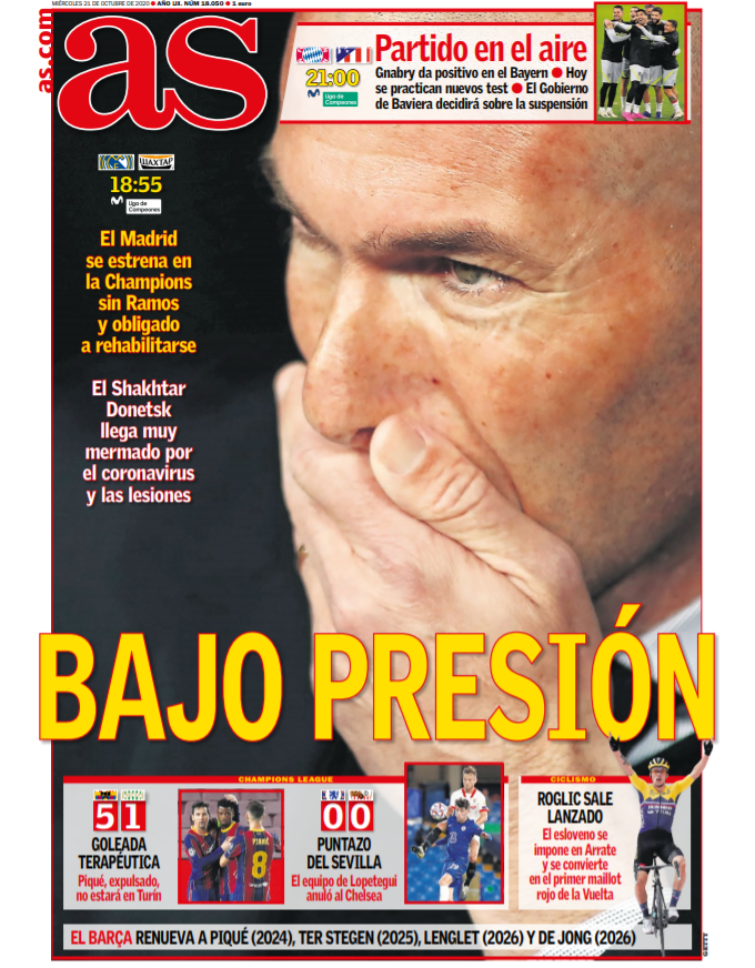 ركزت الصحيفة على لقاء ريال مدريد وشاختار في دوري أبطال أوروبا، وأشارت للفرنسي زين الدين زيدان، وكتبت: "تحت الضغط"، كما تحدثت عن لقاء بايرن ميونخ وأتلتيكو مدريد وكتبت: "لقاء في الهواء".