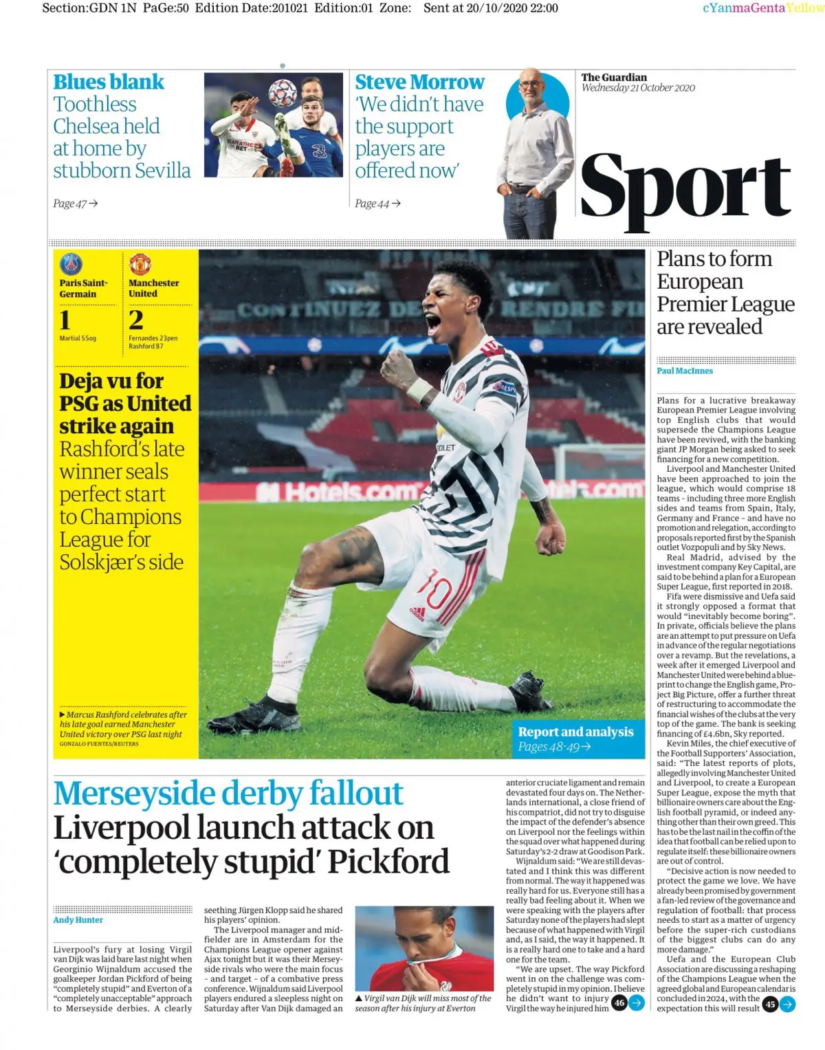 وعن مباراة مانشستر يونايتد ضد باريس سان جيرمان، وفوز الأول (2-1)، عنونت: " راشفورد يترك الأمر للوقت المتأخر مجددا ليقضي على سان جيرمان".