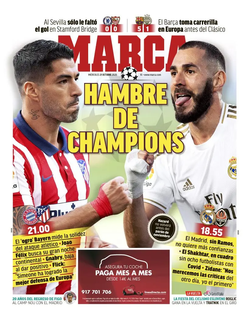 ركزت الصحيفة على لقاءات دور المجموعات بدوري أبطال أوروبا، وكتبت عن مباراتي ريال مدريد ضد شاختار دونيتسك، وبايرن ميونخ وأتلتيكو مدريد: "جوع دوري الأبطال".