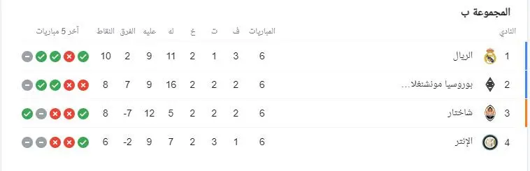 واصل ريال مدريد الإسباني مشواره في بطولة دوري أبطال أوروبا لكرة القدم، عقب فوزه الثمين والمستحق 2 - صفر على ضيفه بوروسيا مونشنغلادباخ الألماني يوم الأربعاء في الجولة السادسة (الأخيرة) بالمجموعة الثانية من مرحلة المجموعات للمسابقة القارية، التي شهدت أيضا تعادل إنتر الإيطالي بدون أهداف مع ضيفه شاختار دونتيسك الأوكراني.
