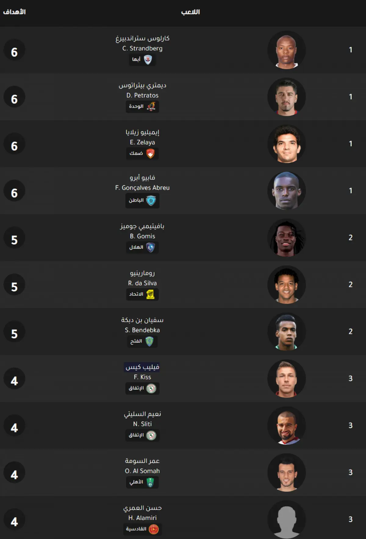 ويتصدر كارلوس ستراندبيرغ لاعب أبها ترتيب هدافي الدوري السعودي مع ديمتري بيتراتوس لاعب الوحدة، وإيميليو زيلايا نجم ضمك، وفابيو أبرو لاعب الباطن، ولكل منهم 6 أهداف.