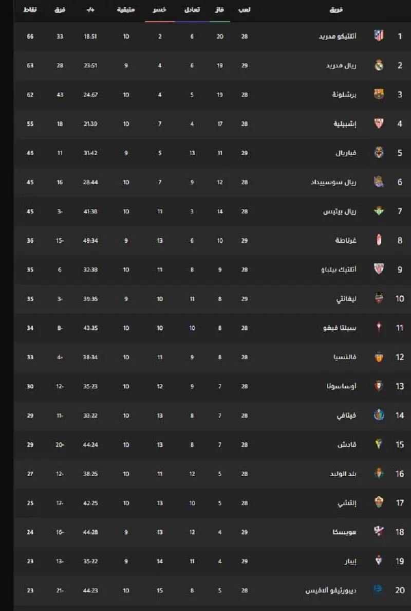 فيما توقف رصيد إيبار عند النقطة 23 في المركز الـ19.