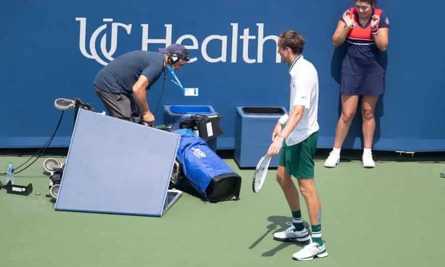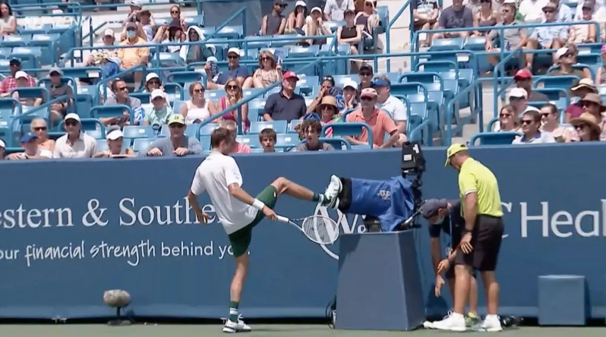 اصطدم الروسي دانييل ميدفيديف، المصنف الثاني عالميا، بكاميرا في جانب الملعب قبل أن ينفجر غضبا خلال خسارة مفاجئة 6-2 و3-6 و3-6 أمام مواطنه الروسي أندريه روبليف في قبل نهائي بطولة سينسناتي للتنس، يوم السبت.