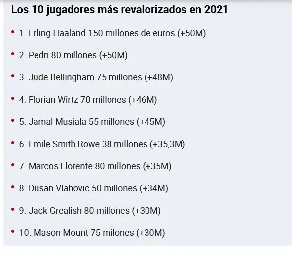 وتصدر النرويجي إيرلينغ هالاند، مهاجم بروسيا دورتموند، والإسباني بيدري، لاعب وسط برشلونة، قائمة اللاعبين الذين شهد سعرهم ارتفاعا بشكل كبير، حيث كسبوا في 2021 مبلغ 50 مليون يورو، وارتفعت قيمة النرويجي من 100 مليون يورو إلى 150 مليون يورو، والإسباني من 30 إلى 80 مليون يورو.