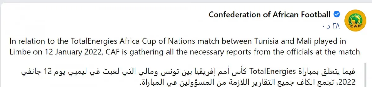 وقال الاتحاد الأفريقي لكرة القدم في بيان رسمي: "فيما يتعلق بمباراة كأس أمم أفريقيا بين تونس ومالي التي لعبت في ليمبي يوم 12 يناير 2022، تجمع الكاف جميع التقارير اللازمة من المسؤولين في المباراة".