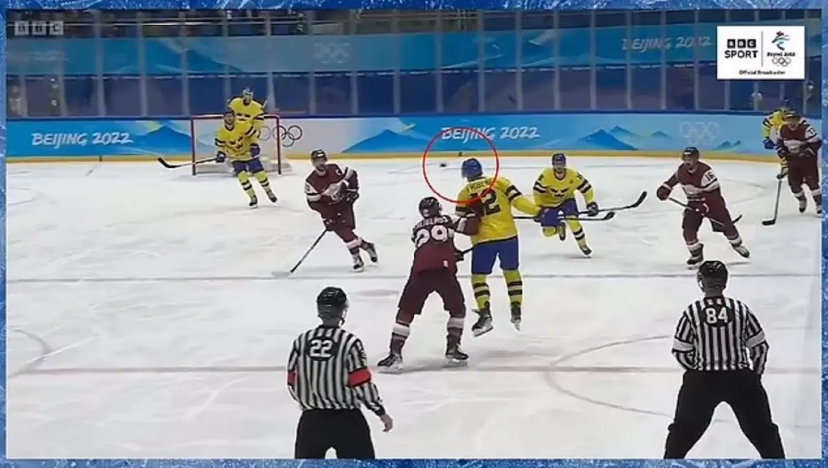 وكان فريبيرغ المهاجم السويدي بعيدا عن القرص مع تبقي 11.33 دقيقة على نهاية الشوط الثاني عندما قفز القرص أمامه، لكنه كان مرتفعًا للغاية بالنسبة للاعب البالغ من العمر 29 عامًا وكان صعبا عليه أن يلعبه بالمضرب، لذلك قفز ليعيد الكرة إلى الجليد برأسه ويساعد فريقه في الدفاع عن تقدمه مع عودة لاتفيا للمباراة.