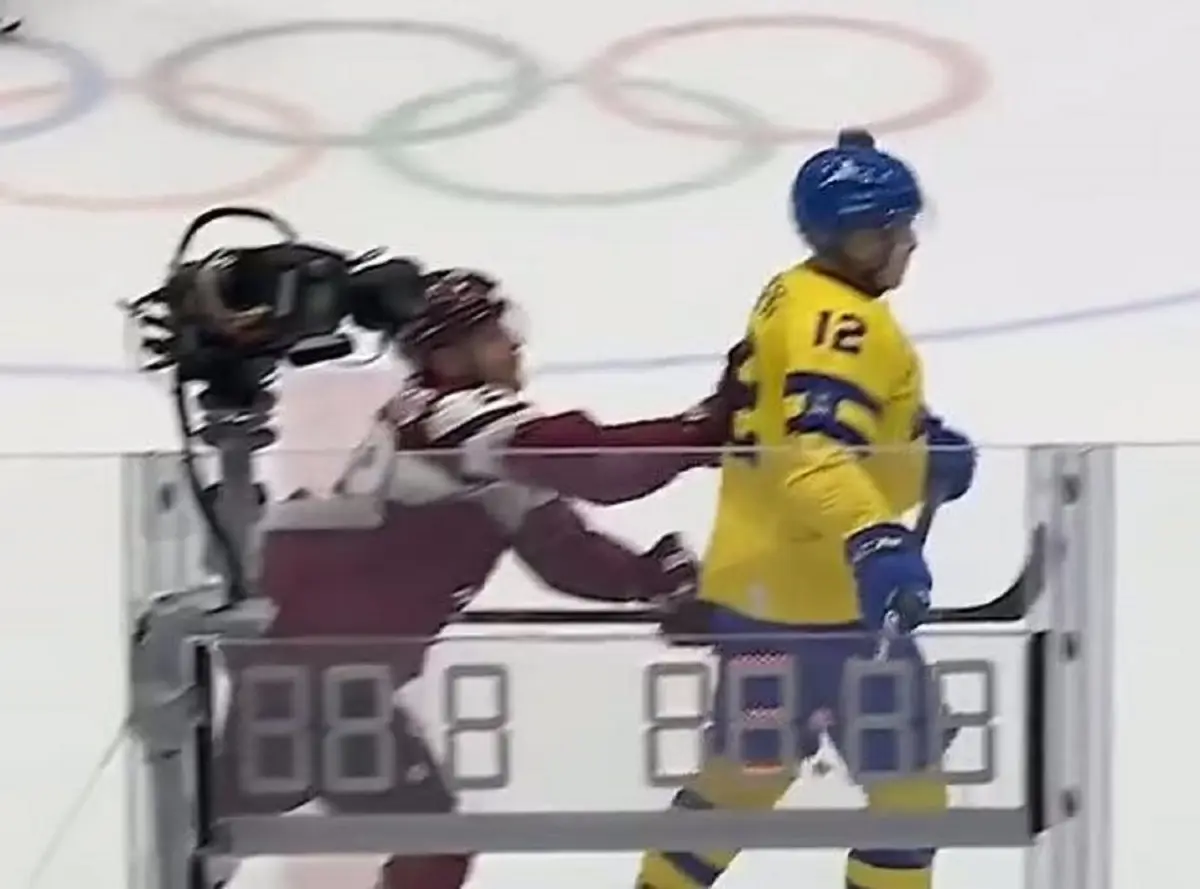 وقفز جناح فريق فرولوندا السويدي، الذي لعب مع أنهايم دكس في دوري هوكي الجليد في أمريكا الشمالية سابقا، ولعب القرص برأسه في مباراة ضمن المجموعة الثالثة في الأولمبياد الشتوي.