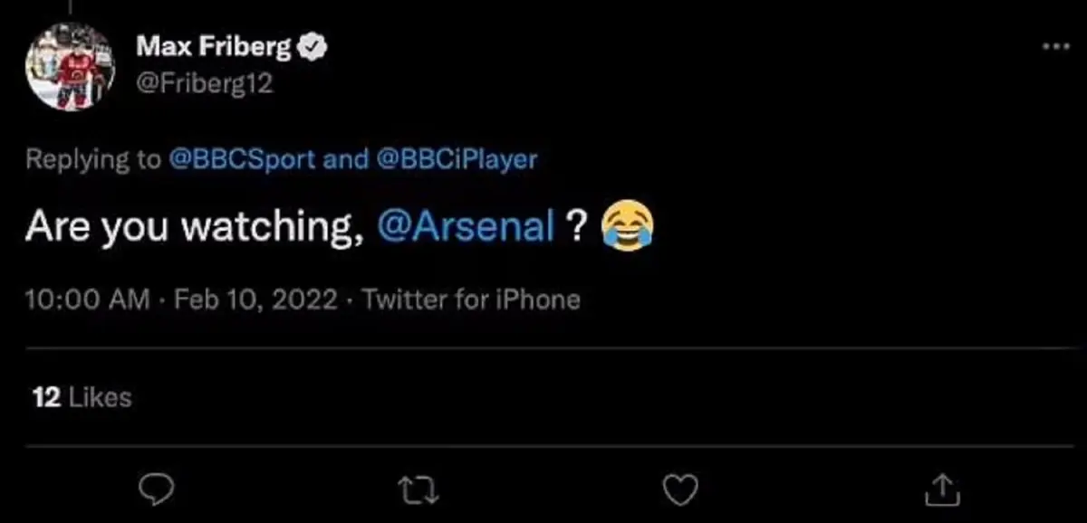 حث المهاجم السويدي ماكس فريبيرغ فريق آرسنال المنافس في الدوري الإنجليزي الممتاز على مشاهدة ضربة رأس نفذها في فوز منتخب بلاده 3/2 على لاتفيا في مسابقة هوكي الجليد في دورة الألعاب الأولمبية الشتوية 2022.
