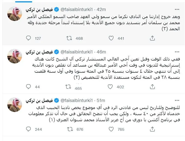 وتابع: "وبعد خروج إدارتنا من النادي تكرما من سمو ولي العهد صاحب السمو الملكي الأمير محمد بن سلمان أمر بتسديد ديون جميع الأندية بلا استثناء لتبدأ مرحلة جديدة ولله الحمد".