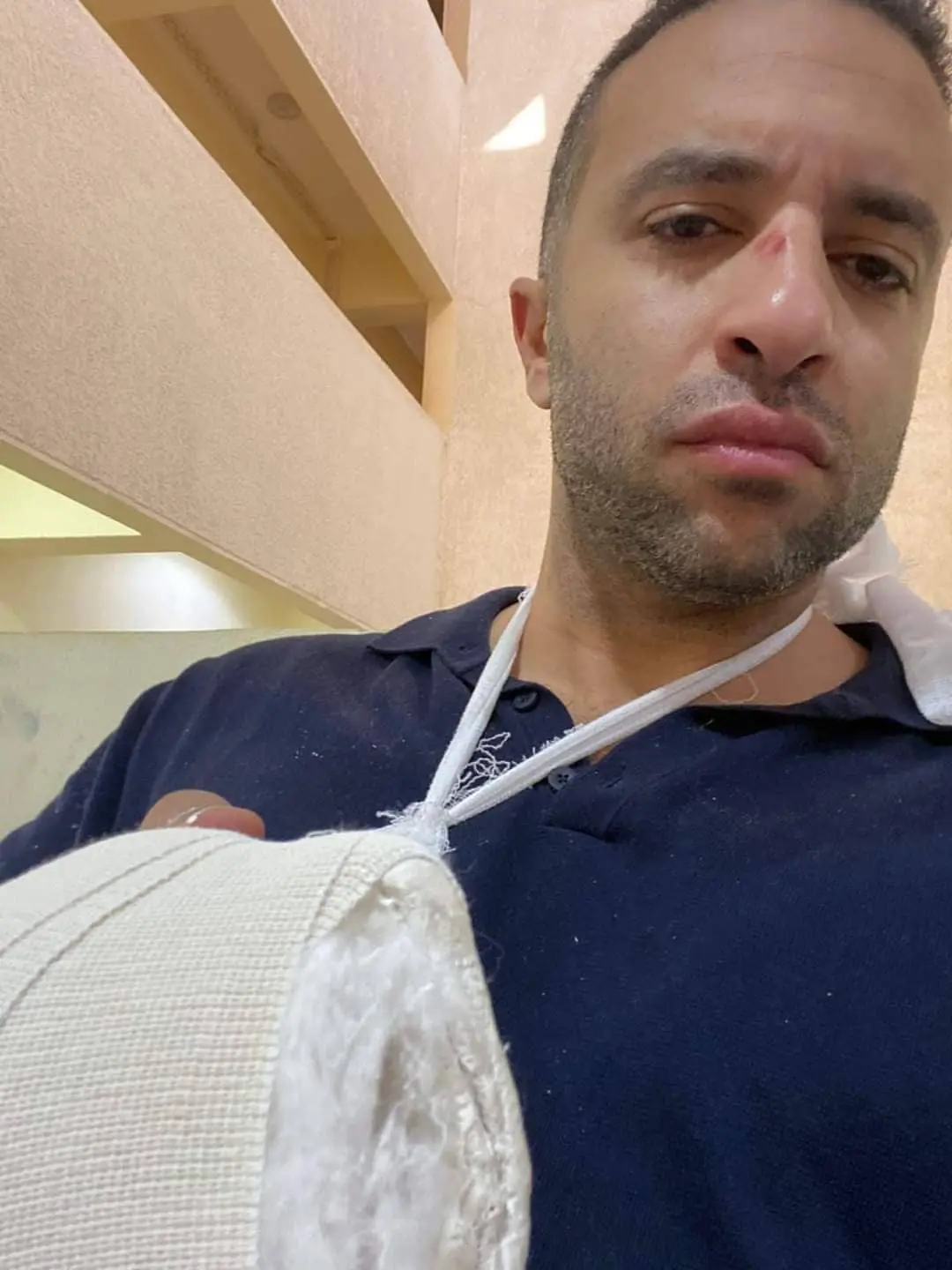 وتداول مقربون من محمد سراج صورًا لعضو مجلس إدارة الأهلي، ويديه في "جبيرة" بالإضافة إلى صورة تظهر تهشم سيارته.