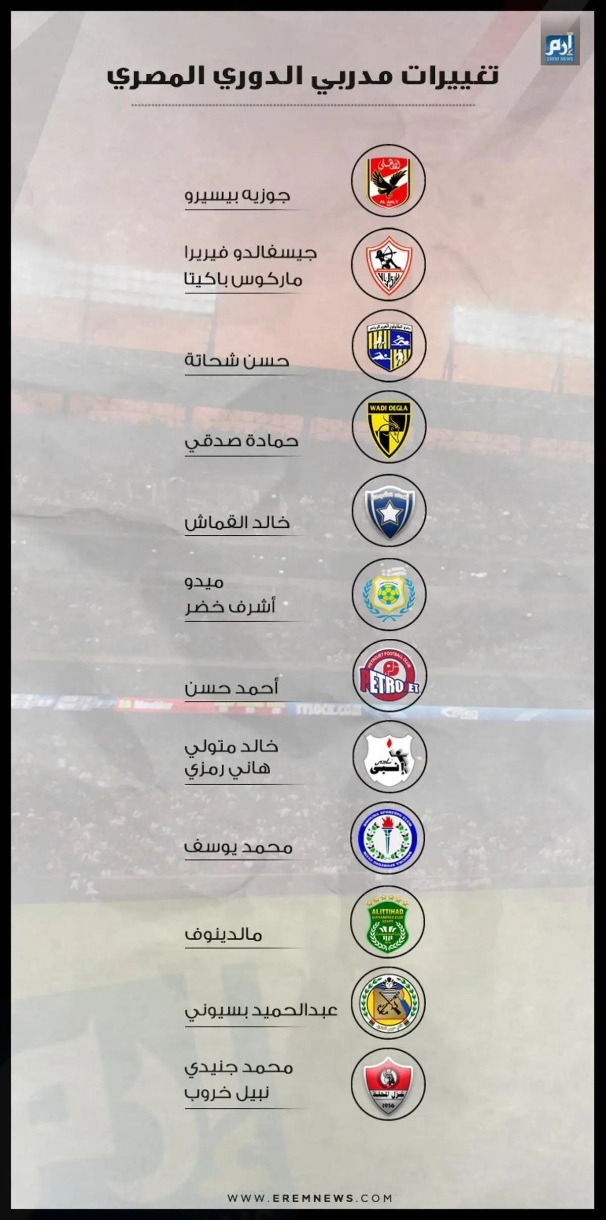 وترصد شبكة إرم الإخبارية، خريطة تغييرات مدربي الدوري المصري في الإنفوجرافيك التالي، حيث قامت تلك الأندية بتغيير مدربيها: