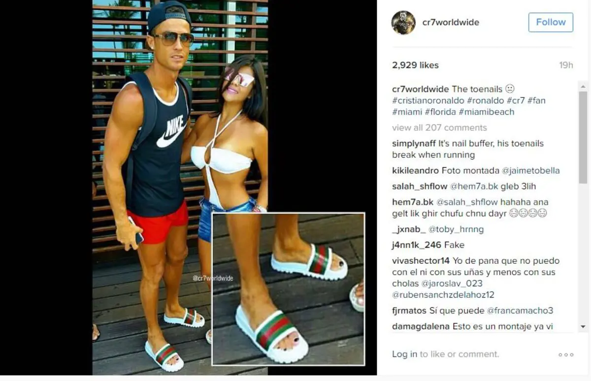وكشفت الصور عن رونالدو وهو يضع طلاء الأضافر باللون الأسود، وهو يسترخي على شواطئ مدينة ميامي الأمريكيّة.