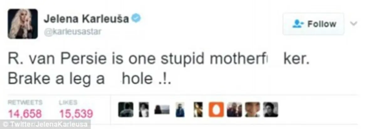لكن الزوجة الحسناء حذفت التغريدة فيما بعد بناء على طلب من دوسكو قائلة "دوسكو طلب منى أن أحذف تغريدتي عن فان بيرسي وأنا فعلت ذلك.. ماذا أستطيع أن أقول؟.. لا أحب اللاعبين القذرين.. يحيا جمهور بشكتاش".