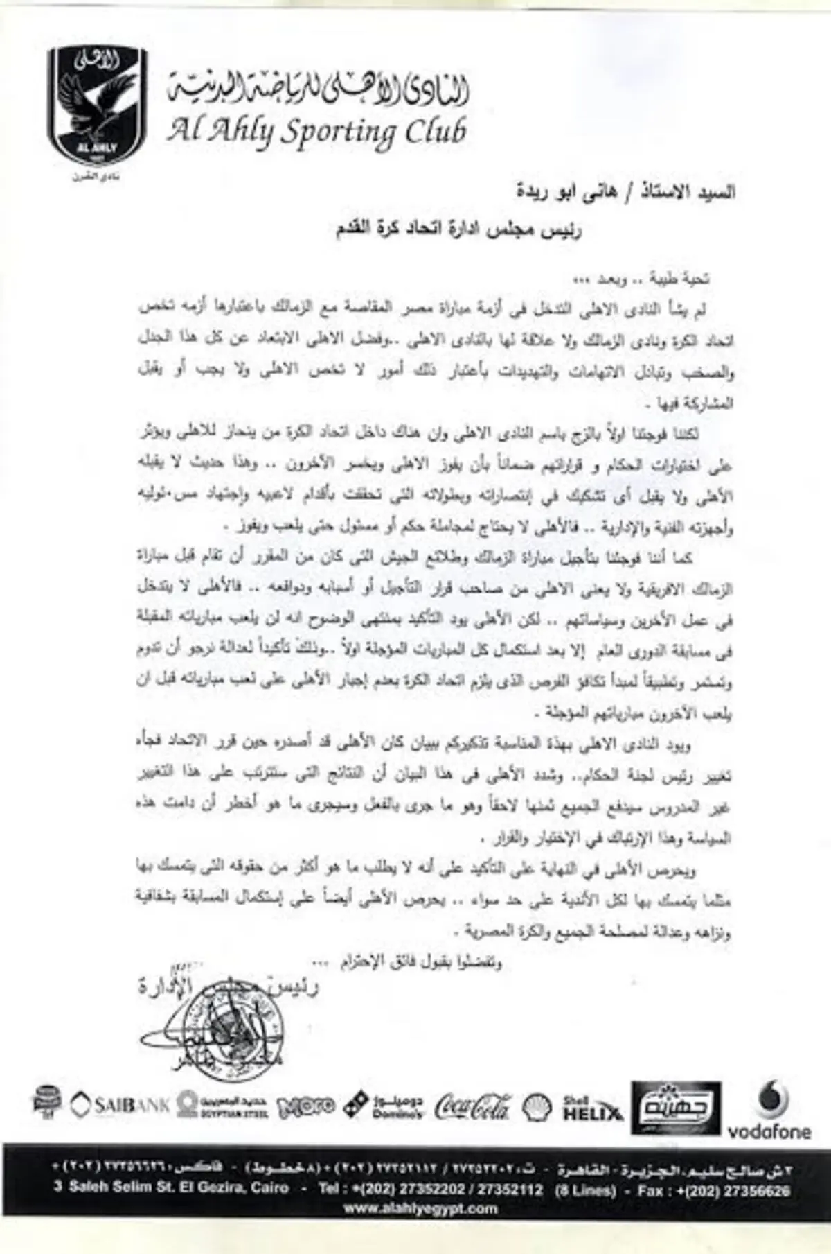 من جهة أخرى، أرسل محمود طاهر، رئيس مجلس إدارة الأهلي، خطابًا لرئيس الاتحاد، يتمسك فيه بعدم خوض الأهلي مبارياته المقبلة في الدوري إلا بعد استكمال المباريات المؤجلة لجميع الفرق المنافسة في البطولة؛ إرساءً لمبدأ تكافؤ الفرص.