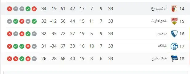بينما حل فريق أوغسبورغ في المركز الرابع عشر برصيد 34 نقطة.