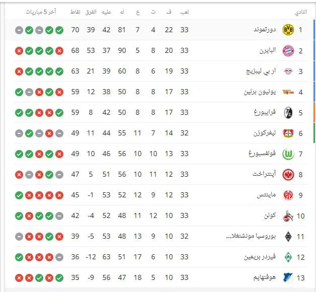 بهذه النتيجة، يتصدر فريق بروسيا دورتموند جدول ترتيب الدوري الألماني برصيد 70 نقطة، بفارق نقطتين عن بايرن ميونخ الوصيف.