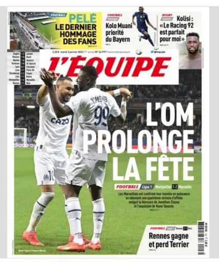 ركزت الصحيفة على فوز أولمبيك مارسيليا على مونبلييه 2-1 ورين على نيس 2-1 في الدوري الفرنسي وكتبت "أولمبيك مارسيليا يمدد الحفل" و"رين يفوز ويفقد تريير".