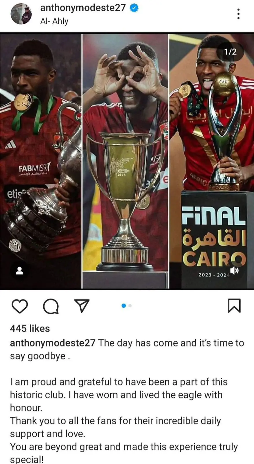 وكتب موديست رسالة عبر حسابه الشخصي بموقع انستغرام مودعًا جماهير الأهلي المصري.