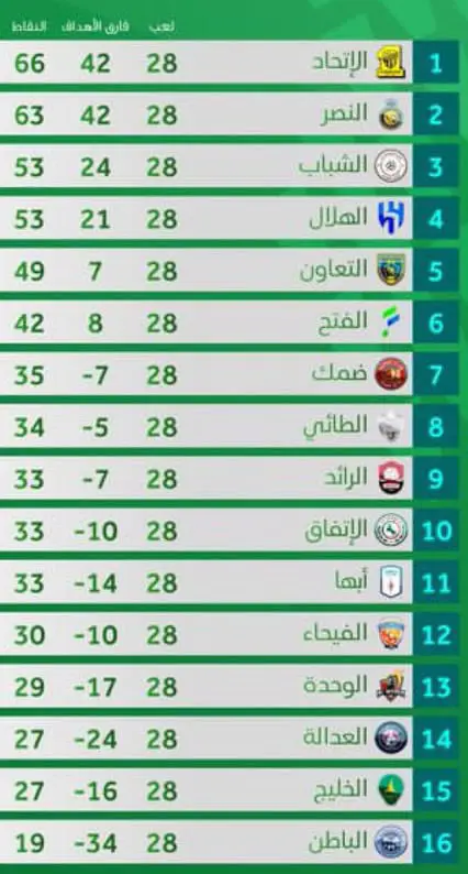 وفيما يلي جدول ترتيب الدوري السعودي:
