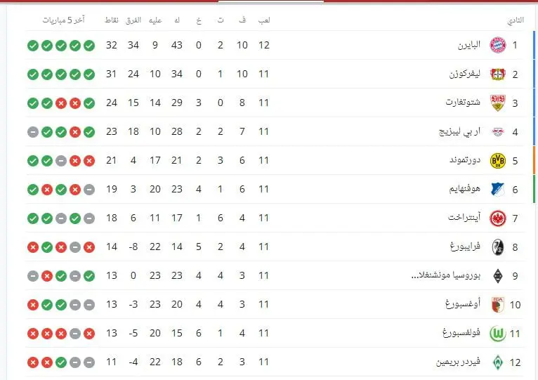 ارتقى بايرن ميونخ إلى صدارة ترتيب المسابقة برصيد 32 نقطة في صدارة الترتيب، بفارق نقطة عن باير ليفركوزن صاحب المركز الثاني