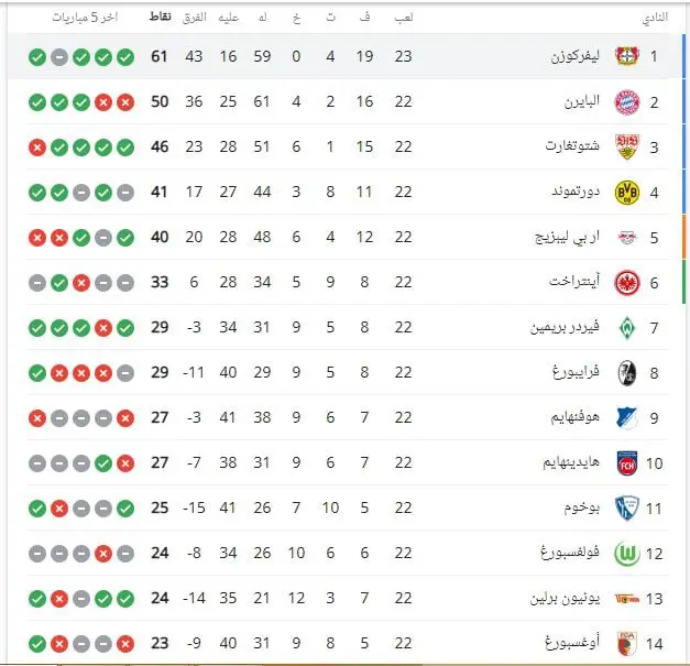 في المقابل، رفع ليفركوزن رصيده إلى 61 نقطة في صدارة الترتيب، ليوسع الفارق بينه وبين بايرن ميونخ الوصيف إلى 11 نقطة.